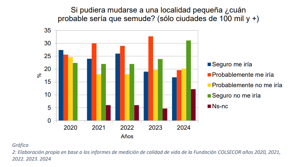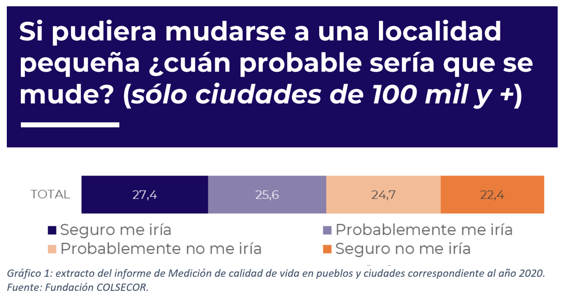These articles merely reflected that trend which, during the quarantine, emerged from urban societies. At that time, a report prepared by the Gente en Movimiento observatory, coordinated by journalist and deputy Gisela Marziotta, was made public. In that work, it was observed that among the inhabitants of the Federal Capital aged 16 to 50, 55% of those surveyed expressed a desire to move out of the city. The percentage dropped to 50% among respondents aged 51 to 60. In the same vein, the Colsecor Foundation, an organization linked to various cooperatives in the interior of our country, reflected in its Quality of Life Measurement in towns and cities for the year 2020 that among respondents from cities with more than 100,000 inhabitants, 27.4% would move to a smaller locality, while another 25.6% would probably do so.