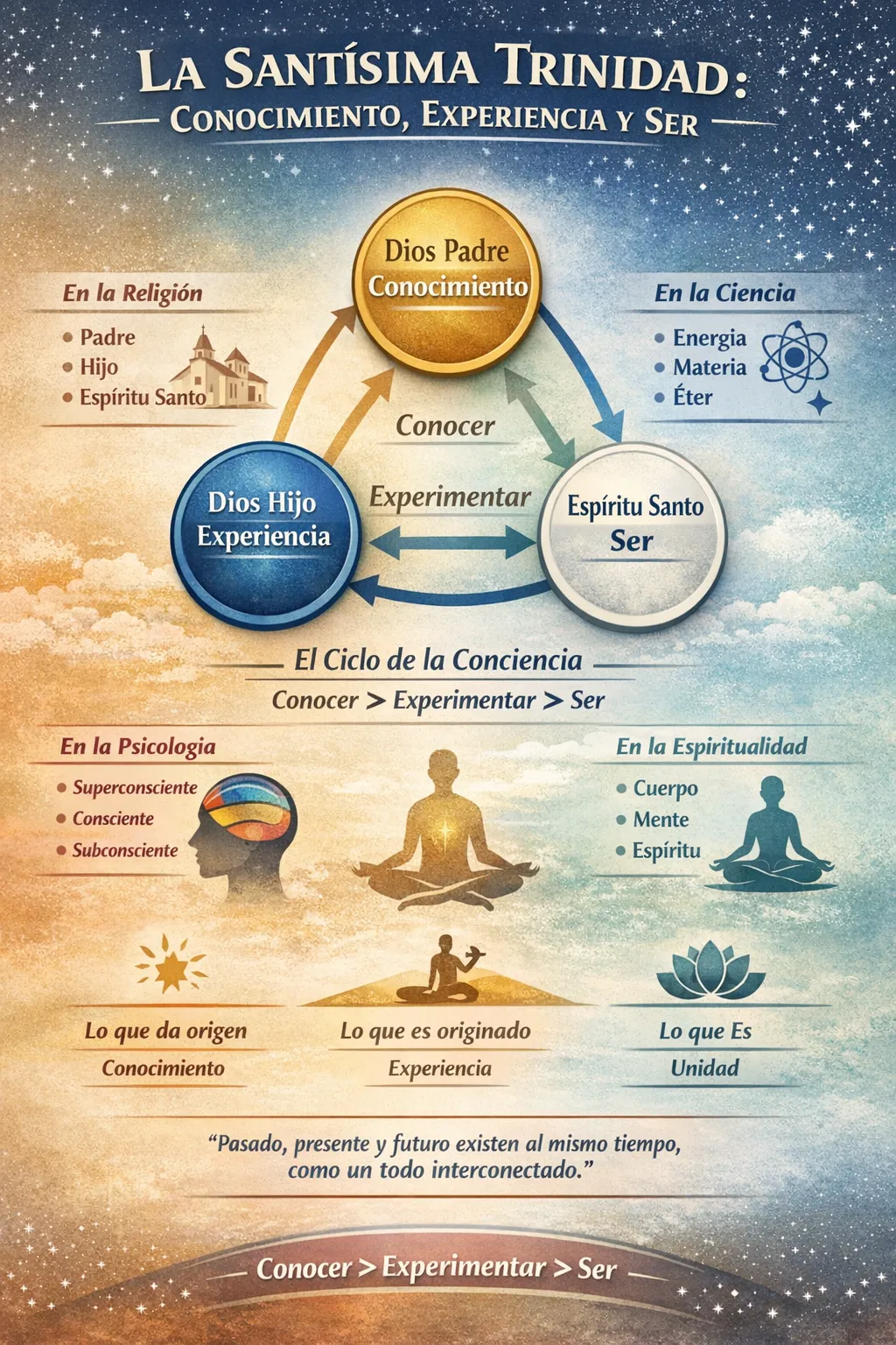 A fragment from Conversations with God by author Neale Donald Walsch offers an unconventional interpretation of the Trinity. Departing from traditional religious dogmas, the text proposes a vision that unites knowledge, experience, and being as three interconnected dimensions of the evolution of consciousness.